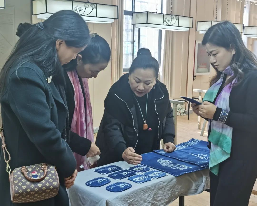 海燕是蓝染传承人,在高校工作,实际上跟我们的同行。她是河南科技学院文化艺术学院副院长,副教授,硕士生导师,还是中国服装设计师协会会员。她的研究方向为染织服装设计,主要从事扎蜡染艺术设计教学研究及服装数字化设计教学研究。作品多次参加国家级、省级展览并获奖。2016年以来,受河南省国脉文化遗产传承保护中心等邀请,参加了多次非遗进校园、非遗进社区、弘扬非遗文化等多次非遗技艺体验活动。2009年起,她便创办了冰竹艺术设计工作室,原创“飘”及“飘·拾色”两个艺术丝巾品牌,带领学生进行“产、学、研、创”的研究与开发,为实践教学搭建校内实践平台。就在来开封的前一晚,她还在指导学生进行蓝染作业。海燕还带来了她新设计的几款作品给施老师指导。施老师也直截了当地提出了看法和建议,海燕高兴异常。