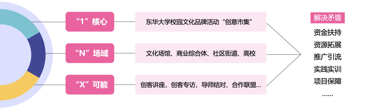 “1+N+X”服务链,“1”即服务链之基,品牌文化活动创意市集;“N”即N类场域,实训场所深度拓展;“X”即多元培养、孵化服务。以文化育人为导向服务青少年,以艺术赋能为桥梁助力青少年,本项目以专家导学、青少年共创、市集实践、课程联动等多元方式,力求构建三级进阶式服务链。创新创意启蒙为一级,创意转化为文创成果为二级,成果孵化实战及指导、保障为三级,为新业态下青少年创新培养提供切实帮助。