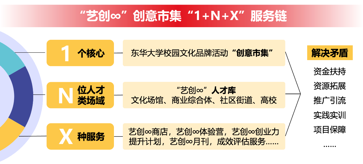 为进一步促进以创业带动就业,发挥就业育人实效,艺创∞平台着眼于广大艺术类青年大学生,为有意向从事艺术类创业的青年提供从孵化、转化再到深化的三级进阶式创业服务。平台以“1+N+X”为服务思路,从“1”个核心,即连续15年举办的JKF 捷克论坛 校园文化品牌活动“创意市集”出发,搭建具有“N”位人才的艺创∞人才库,结合文化场馆等“N”场域的外部资源,开展如艺创∞商店、艺创∞体验营、艺创∞创业力提升计划、艺创∞月刊等“X”类创业服务,并定期通过成效评估检验平台服务效能与品牌发展情况,助力青年大学生创新培养与创业孵化走深走实,让青年人才更有力量,让青年设计更有声量。