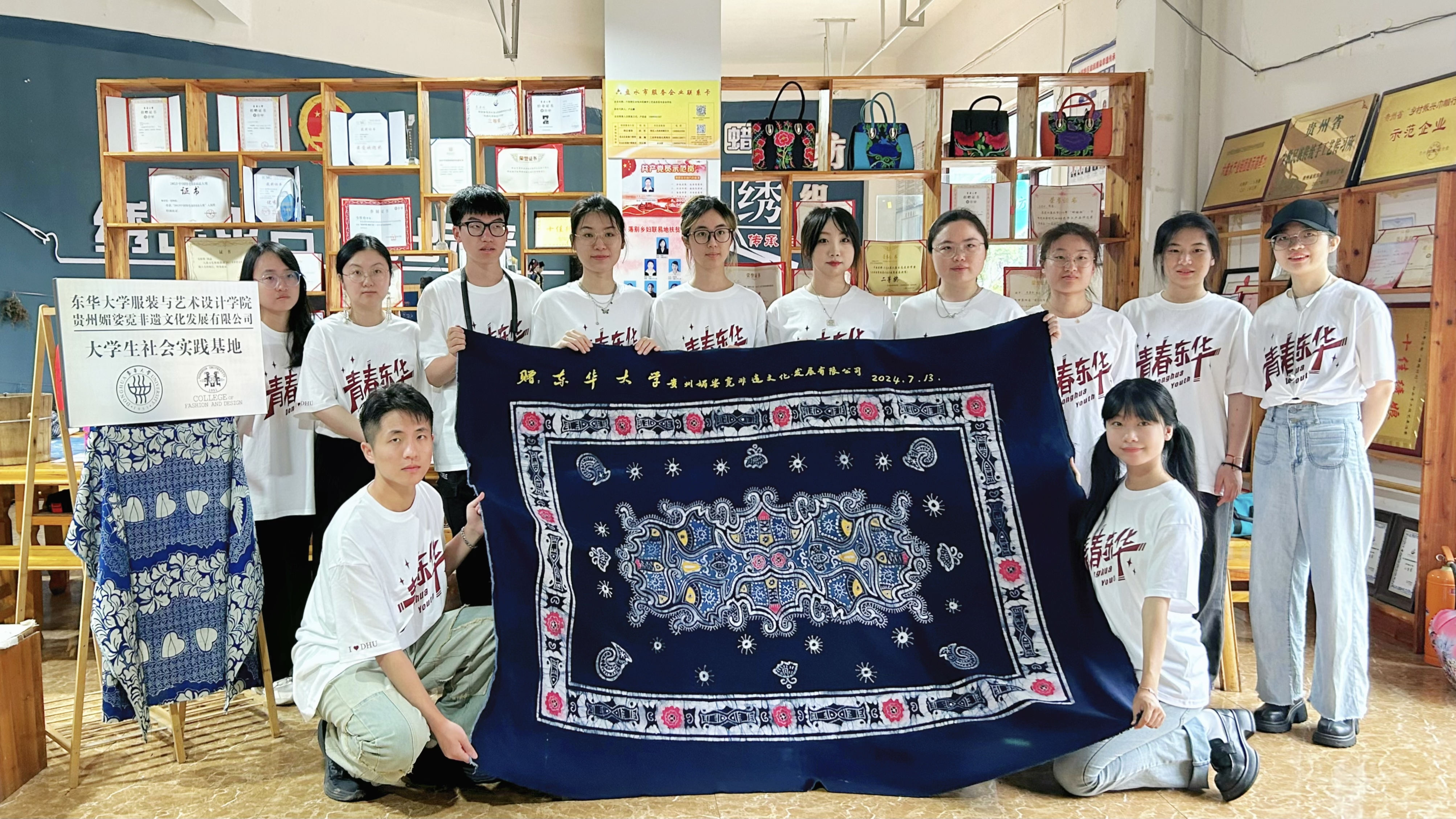 我校非遗研培班第五和第八期学员、贵州媚娑妮非遗文化发展有限公司负责人韦厚珍向学院赠送布依族蜡染作品。韦厚珍是六枝特区落别乡人,也是布依族斗纹布纺织技艺传承人,因非遗与东华结缘,她动情地谈到,两次研培经历让她真切感受到学校对传承人培养的专业敬业、用心用情,东华不仅提升了她的专业素养和创意设计能力,让传统手艺焕发新生,更帮助她开阔了视野,找到了非遗在新时代的发展方向。