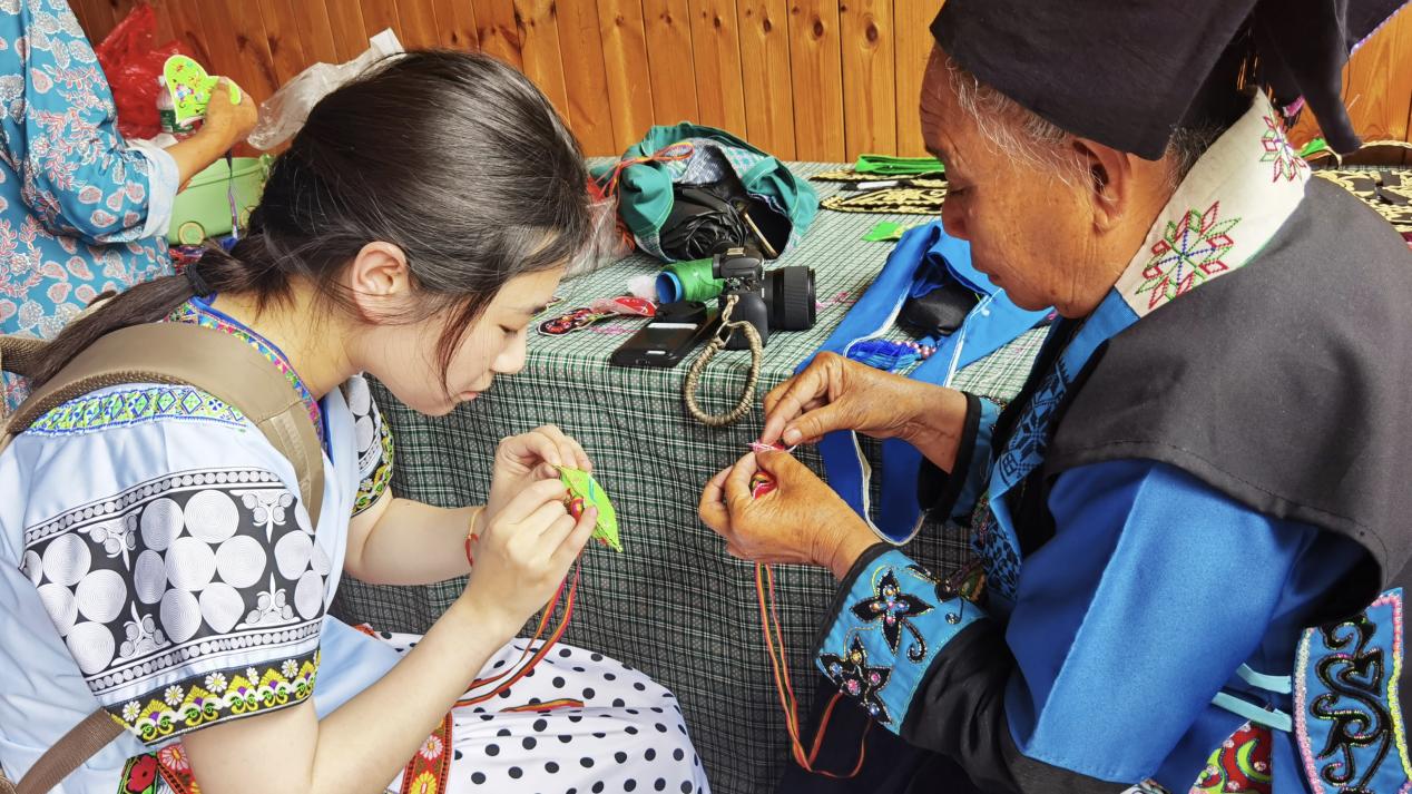 (实践团学生现场体验布依族香包制作)
